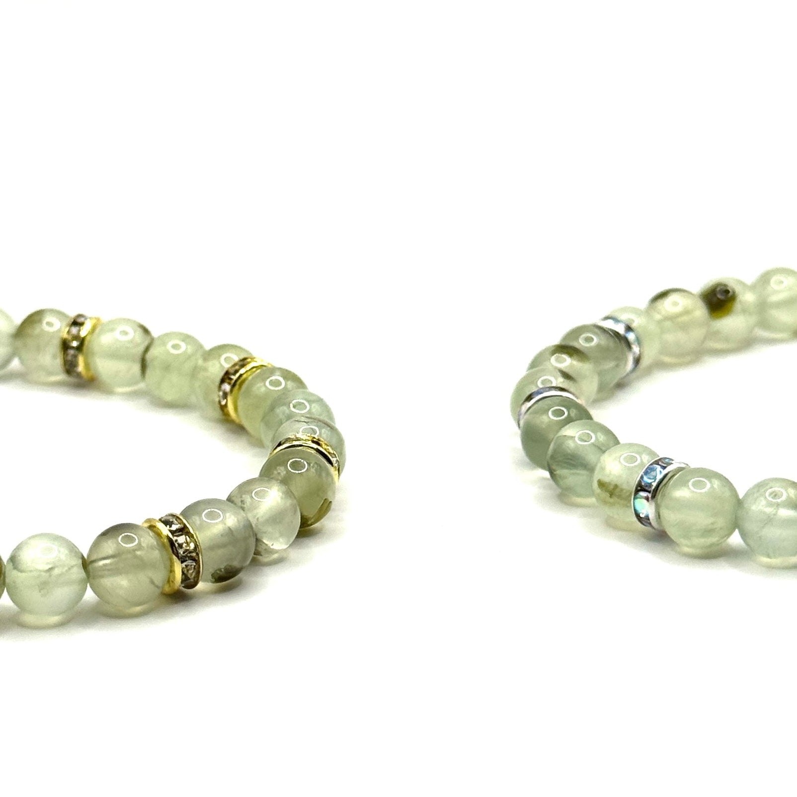 Ein elegantes Armband aus sanft grünem Prehnit, ergänzt durch feine Zwischenstücke und einen hochwertigen Verschluss. Der zarte, natürliche Farbton verleiht dem Schmuckstück eine ruhige und frische Ausstrahlung. Prehnit steht für Gelassenheit, Vertrauen und innere Harmonie und soll das Herz beruhigen.